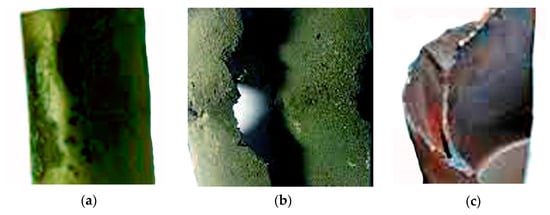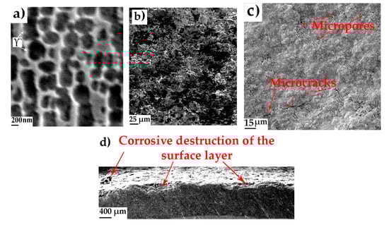 Stage III—the formation of extended cracks, burnouts, and destruction of the material (the catastrophic corrosion) (Figure 2b,c).