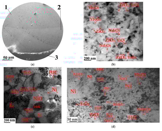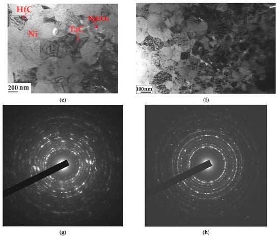 The grain size in materials: base alloy GTD111—0.8 to 0.95 µm (Figure 4a); TBL—0.07 to 0.23 μm (Figure 4b); Alloy 1—0.007 to 0.42 μm (Figure 4c,d); Alloy 2—0.007 to 0.4 µm (Figure 4e,f). The structures in Alloy 1 (Figure 4c) and Alloy 2 (Figure 4d) are heterogeneous and include several compounds–phases. For example, in both alloys (Alloy 1, Alloy 2), there are reinforcing carbide (HfC/TaC) and oxide (Yb2O3/ZrO2/Y2O3/Al2O3/Nd2O3) phases (Figure 4c,d). The size of phases in the TBL layer is as follows (Figure 4b): Nd2O3 = 45–190 nm, ZrO2 = 82–230 nm, Yb2O3 = 35–67 nm, Y2O3 = 7–65 nm. The size of phases in the Alloy 1 layer is as follows (Figure 4c,d): Ni = 192–420 nm, HfC =185–415 nm, Nd2O3 = 45–190 nm, ZrO2 = 82–210 nm, Yb2O3 = 35–67 nm, Y2O3 = 12–65 nm, Al2O3 = 15–25 nm, Re = 35–75 nm, NiO = 7–15 nm. The size of phases in the Alloy 2 layer is as follows (Figure 4e,f): Ni = 192–420 nm, HfC =185–415 nm, TaC = 192–395 nm, Nd2O3 = 45–190 nm, ZrO2 = 82–210 nm, Yb2O3 = 35–67 nm, Y2O3 = 12–65 nm, Al2O3 = 15–25 nm, Re = 35–75 nm, NiO = 7–15 nm. The main reflections of the microelectron diffraction patterns of the layers (Alloy 1 (Figure 4g), Alloy 2 (Figure 4h)) belong to the Ni phases with a cubic lattice, to the HfC phases with a cubic lattice, and to the Nd2O3 phases with a hexagonal lattice. The layered composite materials mainly consist of nanocrystalline grains, randomly misoriented, so the diffraction is ring-shaped (Figure 4g,h). According to the type of microelectronograms, it can be concluded that in the layers (Alloy 1 and Alloy 2), there is an overlap of phases on each other, which is confirmed by the X-ray analysis (Figure 5).