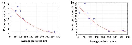 The dependence of the average grain size (n, nm) on the percentage content (P, %) in the layers of the composite is described by Equations (1) and (2), obtained by processing experimental data in the Statistica 10.0 program.