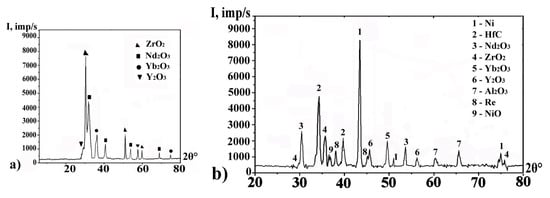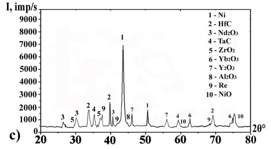 The results of the X-ray phase analysis showed that the thermal barrier layer consists of a tetragonal ZrO2 phase, a hexagonal phase of Nd2O3, a cubic Yb2O3 phase, and a cubic Y2O3 phase (Figure 6a). The Alloy 1 (Table 1) layer consists of a cubic Ni phase, a cubic HfC phase, a tetragonal ZrO2 phase, a hexagonal phase of Nd2O3, a cubic Yb2O3 phase, a cubic Y2O3 phase, a hexagonal Re phase, a cubic NiO phase, and a hexagonal Al2O3 phase (Figure 6b). The Alloy 2 (Table 1) layer consists of a cubic Ni phase, a cubic HfC phase, a cubic TaC phase, a tetragonal ZrO2 phase, a hexagonal phase of Nd2O3, a cubic Yb2O3 phase, a cubic Y2O3 phase, a hexagonal Re phase, a cubic NiO phase, and a hexagonal Al2O3 phase (Figure 6c).