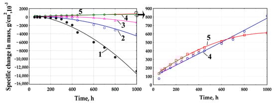 The specific change in mass (Δm, 10−3, g/cm2) depending on the test time (T, h) changes according to a polynomial dependence (Figure 7) and can be described by empirical Equations (3)–(7), obtained from the mathematical analysis of the experimental data in the Statistica v10.0 program: