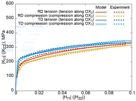 To identify model parameters and verify model results, the data calculated using the model (7)–(8) were compared with the experimental results obtained for tension (compression) of pure titanium specimens in different directions (rolling direction—RD and transverse direction—TD) [].
