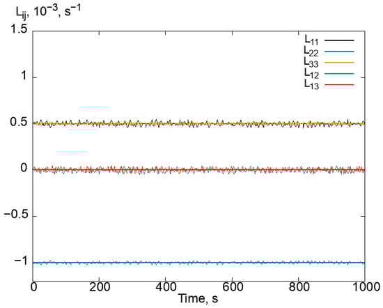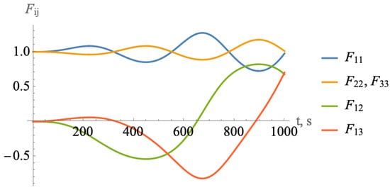 where A = 10, s−1 are the constant parameters, , T = 1000 s is the time at which the deformation is stopped, is the basis of the fixed laboratory coordinate system. For illustration purposes, Figure 3 demonstrates how the deformation gradient components change with time. Complex loadings of type (12) can be realized in the process of volumetric stamping of articles. Therefore, in order to analyze these influences, we have to investigate the stability of the response obtained using CM.