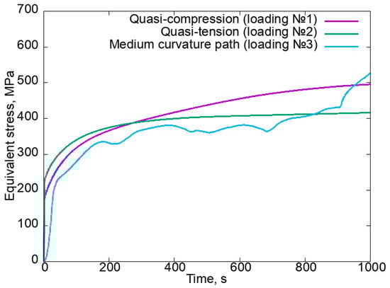 Time dependences of the equivalent stress for quasi-uniaxial compression along RD (purple curve), quasi-uniaxial tension along TD (green curve), and complex loading along the medium curvature strain path (12) (blue curve).
