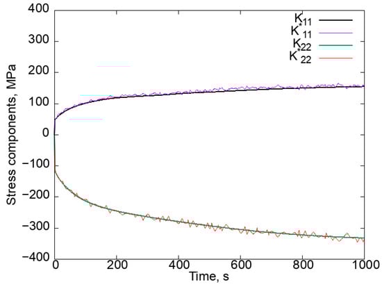 Time dependence of the components and for load 1 (quasi-uniaxial compression along RD) at .