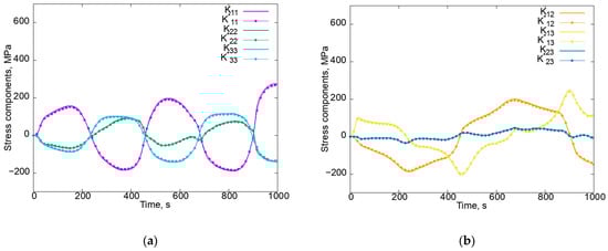Figure 5 presents the time dependences of the perturbed and base components for load 1 (RD quasi-uniaxial compression) at .