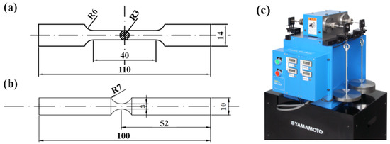 Cylindrical dog-bone specimens were adopted in this study for the evaluation of the mechanical properties of specimens, while the dimensions of specimens for tensile and fatigue experiments are presented in Figure 2a,b. The surface of specimens was polished by grade 600, 1000, 1500, and 2000 abrasive papers, successively. The tensile experiments were carried out on an MTS 810 testing machine, where the adopted strain rate was 10−4 s−1. Rotating bending fatigue testing was conducted on a YAMAMOTO (Osaka, Japan) rotating bending machine, as shown in Figure 2c, with a fixed frequency of 52.5 Hz and a stress ratio of −1. During rotating bending fatigue testing, one end of the specimen is fixed on the bearing while the other end is loaded with weights. The loading amplitude ((MPa)) is adjusted by different weights (P(N)):