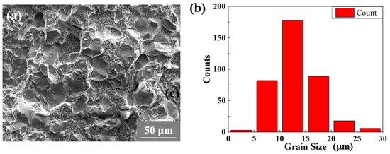 To numerically assess the influence of inclusion for the fatigue performance of GCr15, a microstructure-sensitive model based on CPFEM was established with ABAQUS UMAT v12.0. The distributions of RVEs are derived based on the size distribution of prior austenite grains, which are displayed in Figure 3a,b. Figure 3a is a typical mixed intergranular and transgranular fractography obtained from the fracture surface. First, about 20 images are captured from the mixed intergranular and transgranular zone. Then, the images are processed by software Image Pro Plus (v5.0), where the original images are turned into gray/white images and the areas of prior austenite grains are counted and measured. The size distribution is presented in Figure 3b, obtained through 378 counted grains with an average of 13.2 µm.