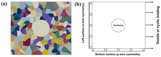 Based on microscopic details, an RVE with 200 grains (210 μm × 185 μm) is established with the Voronoi method and the average grain size is 13.2 μm. To investigate the influences of inclusions on GCr15 alloy under VHCF loading, a circle inclusion is put at the center of the RVE, as shown in Figure 4a. The sizes of most inclusions range from 15 to 35 μm, with some inclusions reaching 55 μm. Therefore, the converted circle inclusion radii range from 5 μm to 40 μm. The inclusion is set with elastic modulus E = 370 MPa and Poisson ratio μ = 0.4 [7]. According to Cong et al. [45] and Zhang et al. [46], it is assumed that there is no interfacial gap between the inclusion and the matrix. In the case of fatigue loading, the y-axis symmetry boundary is only applied to the bottom surface, and the right surface is set to uniaxial tensile or cyclic loading along the x-axis, as shown in Figure 4b. Triangular waves with different stress amplitudes are adopted in the fatigue loading simulations.