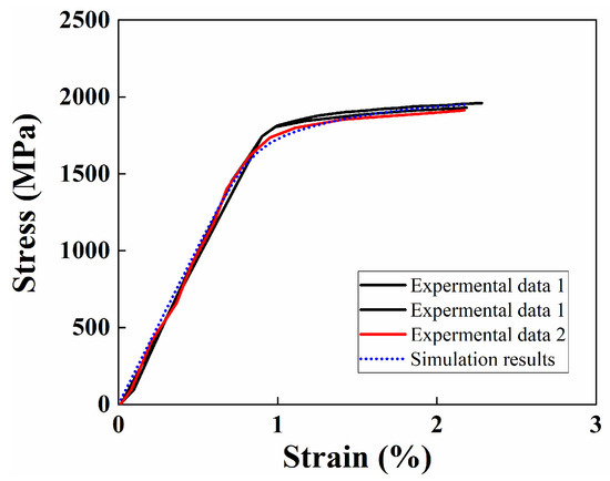 Stress–strain curves of GCr15 specimens under uniaxial tensile loading and the corresponding CPFEM simulations.