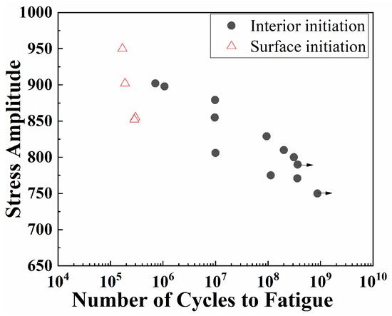 The S-N plot of experimental data of GCr15 bearing steel under rotating bending fatigue loading with a loading frequency of 52.5 Hz is presented in Figure 6, where the solid circular symbols “●” represent the fatigue data of interior crack initiation and the triangle symbols “△” represent the fatigue data of surface crack initiation. The data with an arrow “→” indicate unbroken specimens. It is seen that specimens continue to break beyond 107, and the fatigue strength corresponding to fatigue lives of 109 is about 100 MPa lower than those of 107, which is already beyond the scope of the data scatter. Although scatters of fatigue lifetimes in experiments are very common, for materials which have obvious fatigue limits such as low-strength steels, 3s (s = 10 MPa) is generally taken as the maximum scatter of fatigue strength. In this study, the fatigue strength corresponding to fatigue lives of 107 is about 850 MPa, while the fatigue strength corresponding to fatigue lives of 109 is about 750 MPa. The fatigue strength decreases by 100 MPa, which suggests that the failure at 109 is no more than the scatters of fatigue lifetimes, and new failure mechanisms appear. It is clearly seen that the surface failure mode tends to occur at higher stress amplitudes and lower fatigue lifetimes, while the interior failure mode generally occurs at lower stress amplitudes and longer fatigue lifetimes.
