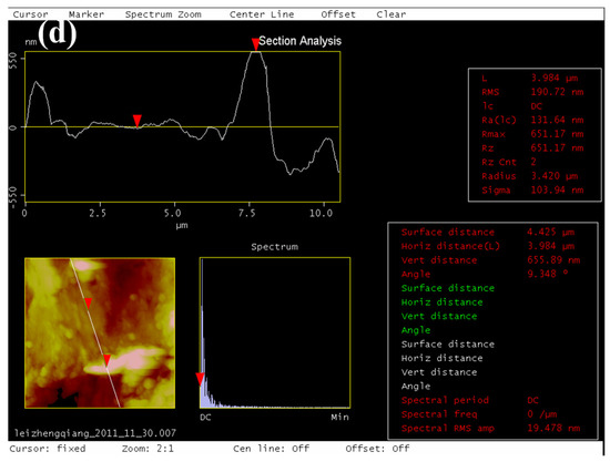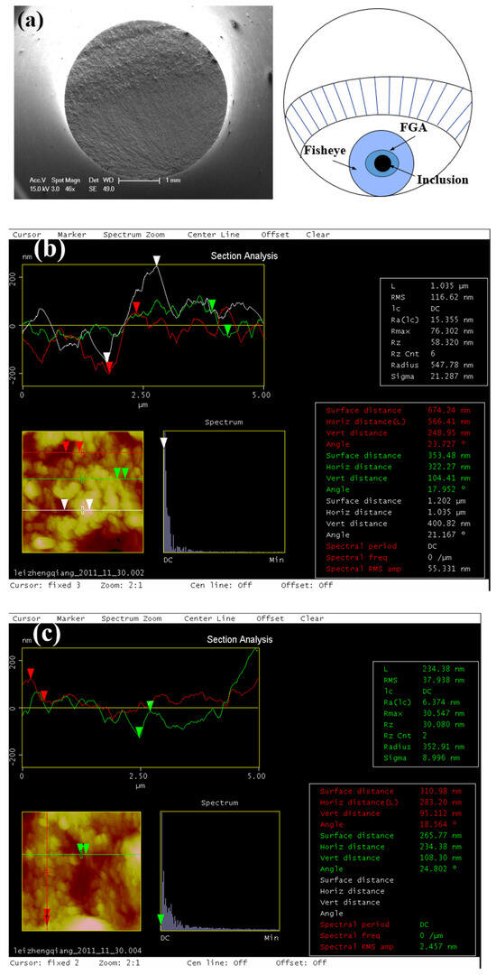 The typical patterns of the subsurface defect-initiated fracture surface are displayed in Figure 7a, where failure generally originates from inclusions, accompanied by a rough surface called an FGA (Fine Granular Area) and a fish-eye pattern zone. The fracture surface morphology and roughness curve of the FGA, fish-eye zone, and outer perimeter of the fish-eye zone are observed by AFM and presented in Figure 7b–d. It is seen that the FGA zone has a relatively higher surface roughness, which is 3 times that of the fish-eye zone, while the surface roughness of the outer perimeter of the fish-eye zone is about 10 times that of the fish-eye zone. This difference in surface roughness between different zones suggests different crack propagation mechanisms.