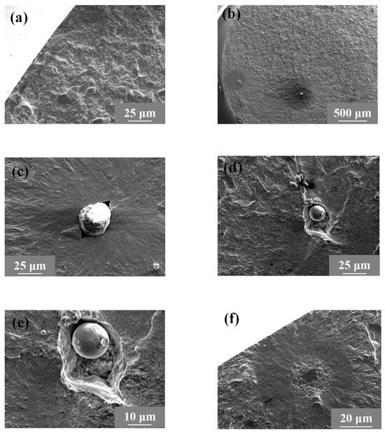 The morphologies of crack initiation sites at different loading amplitudes and fatigue lifetimes are investigated and presented in Figure 8. When the loading amplitude is high, the crack initiates from the specimen surface as shown in Figure 8a. At lower stress amplitudes, the fatigue lifetimes are higher and a fish-eye pattern appears as shown in Figure 8b,c, where the outer perimeter of the fish-eye is generally close to the specimen surface. When the stress amplitude is lower, FGA zones appear around the inclusions, as shown in Figure 8d,e. There are some special fracture modes where the crack initiates from microfacet debonding as shown in Figure 8f, which is also reported by several studies.