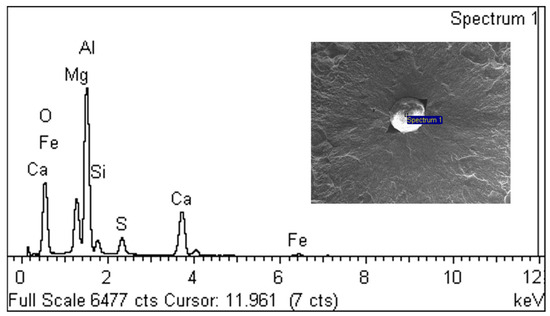 Chemical composition analysis of crack-induced inclusion by EDX examination, where the inserted image is a typical inclusion found in the fracture surface.
