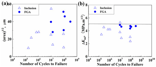It is also noticed that an FGA only appears when the fatigue lifetimes are relatively higher. The range of the stress intensity factor (SIF) around the inclusion and FGA, ΔKini, is computed and presented in Figure 10b. It is shown that the values of ΔK for inclusions have a random distribution, while they tend to decrease as fatigue life increases, suggesting that smaller inclusions lead to higher fatigue lifetimes. On the contrary, the values of ΔK for an FGA remain almost constant regardless of fatigue life, in the range of 4.5~4.9 MPa·m1/2. It was suggested by Zhao et al. [10,11] that the values of ΔK for an FGA are almost the same for the same kind of material, which only depends on Young’s Modulus (E) and the Burgers vector (b). The results of this study confirmed this assumption. It is also acknowledged by many researchers [9,18,19,20] that an FGA corresponds to the crack nucleation process, and the formation of an FGA consumes most of the fatigue lifetimes. Thus, the area of an FGA will be the same under the same loading amplitude, and a smaller inclusion size leads to a larger area for crack nucleation and longer fatigue lifetimes.