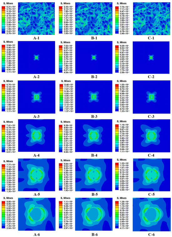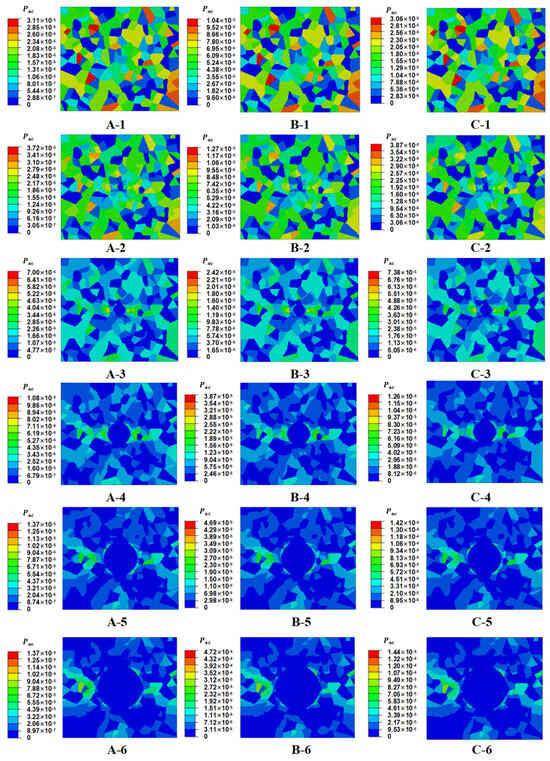 The distribution of plastic accumulated strain after 100 cycles of loading. (A-1–A-6): σmax = 800 MPa; (B-1–B-6): σmax = 900 MPa; (C-1–C-6): σmax = 1000 MPa.