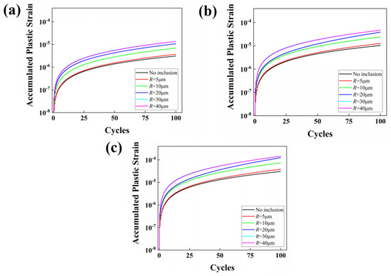 The variations in accumulated plastic strain with the increase in loading cycles are shown in Figure 13. The value of accumulated plastic strain around different inclusion sizes also resembles the crack nucleation or propagation of materials. The plastic strain accumulated around smaller inclusions resembles the damage process of the FGA, while that around larger inclusions resembles the crack propagation process of the fish-eye zone. The Pac around smaller inclusions is very small, suggesting that the crack nucleation process is very slow in the FGA zone, while the Pac around large inclusions is very large, suggesting that the crack propagation rate is fast in the fish-eye zone.
