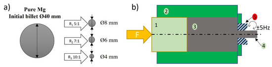Pure Mg in the form of a rod with an initial diameter of Ø40 mm was extruded using KoBo to a diameter of Ø8, Ø6, or Ø4 mm, giving various extrusion ratios: R1 5:1, R2 7:1, and R3 10:1 (Figure 1a). Mg with a technical purity of 99.9% was cast using a Balzers furnace in graphite molds at 680 °C. During KoBo processing, the material was pressed through an extruder with a bilaterally rotating die located at its end. The die moves at high speed; therefore, the material enters into a viscoplastic state (Figure 1b). The initial billet temperature was 24 °C. The KoBo parameters were the same as those used for other Mg alloys: a punch speed of 0.2 mm/s, a die oscillating angle of ±8°, and an oscillation frequency of 5 Hz [18].