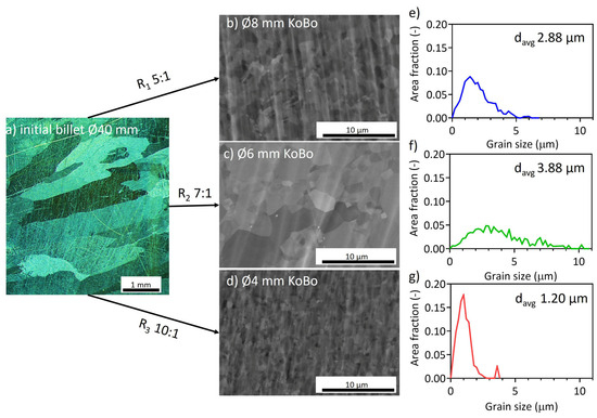 Microstructural images of pure Mg with corresponding grain size distributions: (a) initial billet (optical image), (b) KoBo-extruded to Ø8 mm (R1 5:1), (c) KoBo-extruded to Ø6 mm (R2 7:1), and (d) KoBo-extruded to Ø4 mm (R3 10:1). Grain size distribution for: (e) KoBo-extruded to Ø8 mm (R1 5:1), (f) KoBo-extruded to Ø6 mm (R2 7:1), and (g) KoBo-extruded to Ø4 mm (R3 10:1).