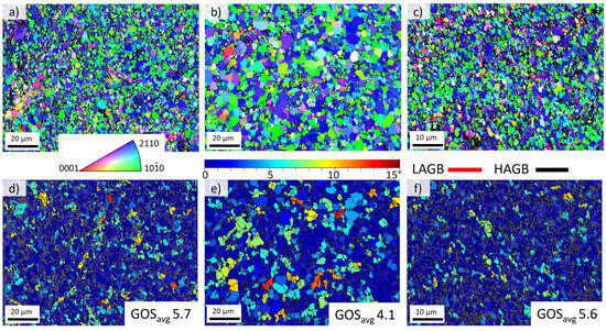 EBSD data presented in the form of inverse pole figure (IPF) maps for Mg (a) KoBo-extruded to Ø8 mm (R1 5:1), (b) KoBo-extruded to Ø6 mm (R2 7:1), and (c) KoBo-extruded to Ø4 mm (R3 10:1), with corresponding grain orientation spread (GOS) maps for Mg (d) KoBo-extruded to Ø8 mm, (e) KoBo-extruded to Ø6 mm, and (f) KoBo-extruded to Ø4 mm. Average values of the grain orientation spread (GOSavg) are given. Data were obtained from the plane perpendicular to the extrusion direction.