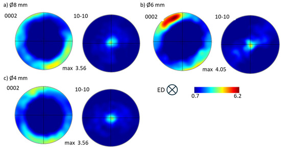 Pole figures (0002) and (10-10) obtained for pure Mg KoBo-extruded to a diameter of (a) Ø8 mm (R1 5:1), (b) Ø6 mm (R2 7:1), or (c) Ø4 mm (R3 10:1); ED—extrusion direction.