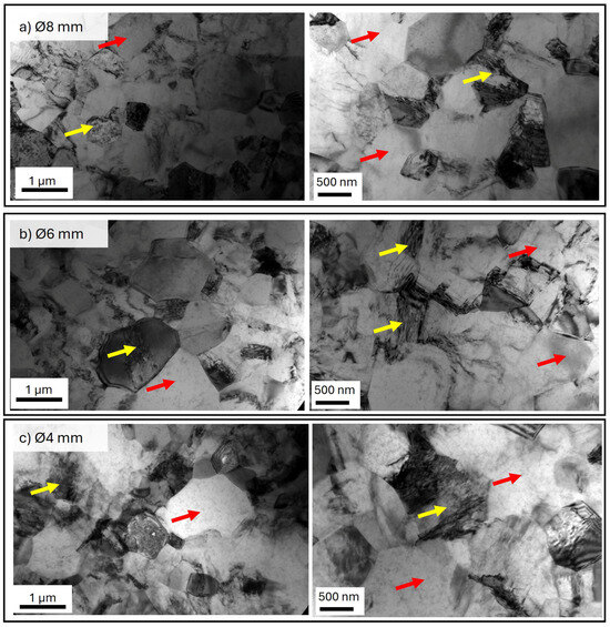 TEM images revealed that the microstructures of the extruded samples were composed of both heavily deformed areas with dislocation tangles inside (yellow arrows, Figure 5) and nearly equiaxed grains with high-angle boundaries and a low dislocation density inside them (red arrows, Figure 5). The microstructure of the sample extruded to Ø8 mm (R1 5:1) consisted of grains with various sizes (Figure 5a) and well-defined boundaries. These factors confirm that DRX takes place during KoBo extrusion [30,31]. At higher deformation ratios (R2 7:1, Ø6 mm), defects in the crystalline structure in the form of dislocations were also observed, and heavily deformed grains were formed (Figure 5b). The differing ratios of the two areas indicated that microstructural reformation during DRX and dynamic recovery (DRV) occurred with a different intensity than in the sample extruded at R1 5:1. KoBo extrusion at the highest deformation ratio (R3 10:1) did not affect microstructural reformation significantly when compared to the sample deformed at R2 7:1 (Figure 5c); however, during TEM observations, a higher number of small grains was distinguishable, which is in agreement with the EBSD data (Figure 3). The microhardness results shown in Figure 6 indicated that increasing the deformation ratio from R1 5:1 (Ø8 mm) to R2 7:1 (Ø6 mm) did not change the microhardness of the materials significantly. The average values of microhardness calculated for these samples were similar: 40.1 ± 1.3 and 41.6 ± 1.2, respectively. Both materials exhibited similar microstructures, particularly with regard to the presence of areas with large, well-developed grains and smaller grains with defects inside. The highest extrusion ratio resulted in a slight increase in microhardness (about 6 HV0.2), which may be related to the smaller grain size formed.