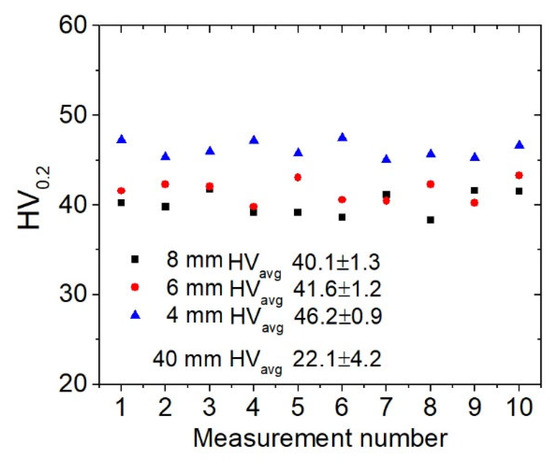Microhardness (HV0.2) tests were performed using the Vickers method under a load of 200 g (Innovatest Falcon 500 Micro/Macro Vickers Tester, Innovatest, Wiry, Poland). Ten points in line were measured on each material.