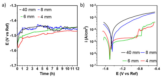 The results delivered by the electrochemical measurements performed in naturally aerated 0.01 M NaCl: (a) Ecorr evaluation during 12 h of immersion; (b) potentiodynamic polarization curves.