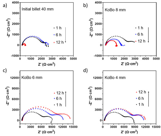 EIS results for pure Mg in naturally aerated 0.01 M NaCl delivered in the form of Nyquist plots: (a) initial billet, (b) KoBo-extruded to Ø8 mm, (c) KoBo-extruded to Ø6 mm, and (d) KoBo-extruded to Ø4 mm.