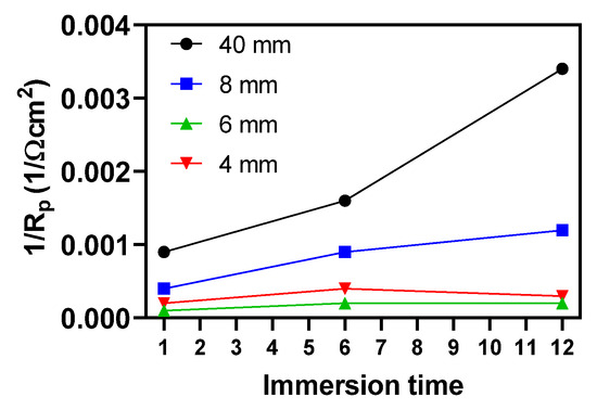 The shape of the Nyquist plot is typical for materials with an oxide layer formed on the surface. It is worth noting that in the case of the sample extruded to Ø6 mm (R2 7:1), the corrosion resistance after 12 h was still increasing, while in the case of the sample extruded to Ø4 mm, it remained at the same level after 6 h of immersion. This is related to the passivation mechanisms occurring on the surfaces (Table 3 and Table 4). The active performance of the initial billet and the sample deformed to Ø8 mm (R1 5:1) caused a weakening in their corrosion resistance with extended immersion time (Figure 8a,b). An increasing trend in the corrosion resistance with extended immersion time was shown for the samples extruded to Ø6 mm (R2 7:1) and Ø4 mm (R3 10:1) (Figure 8c,d). As shown by King et al. [32], circuit simplification enables the calculation of polarization resistance (Rp). Given that the corrosion rate is inversely proportional to Rp, the dependence of corrosion resistance on immersion time for the samples was calculated, and the results are shown in Figure 9. This is clear confirmation that KoBo enhances the corrosion resistance of pure Mg, with a slight increase for the sample with a diameter of Ø8 mm (R2 5:1) and a significant improvement for the material deformed to Ø6 mm (R2 7:1), though a slightly higher corrosion rate was noted for the Ø4 mm (R3 10:1) sample. Clearly, the lowest corrosion rate, regardless of the immersion time, was calculated for the Ø6 mm (R2 7:1) sample.