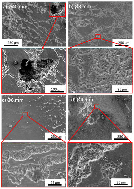 Corrosion damage observed on the surfaces of pure Mg after corrosion product removal after 1 h immersion in naturally aerated 0.01 M NaCl: (a) initial billet (Ø40 mm), (b) Ø8 mm, (c) Ø6 mm, and (d) Ø4 mm.