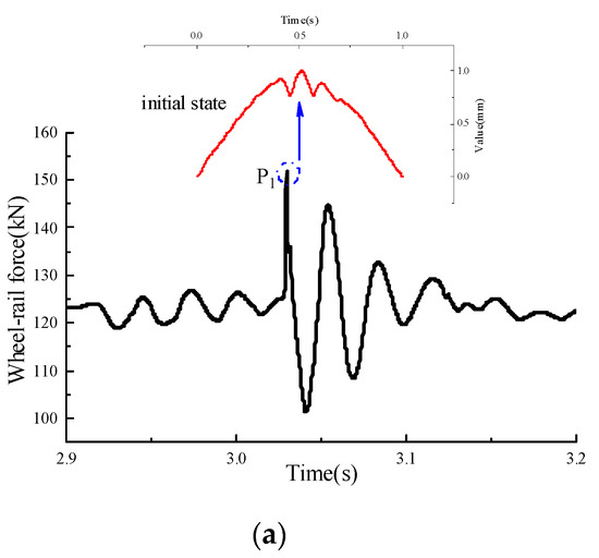 The actual measurement values of the weld irregularities in Figure 2 were input into the established vehicle–track coupling model, and the wheel–rail interactive force under different states was calculated, as shown in Figure 7.