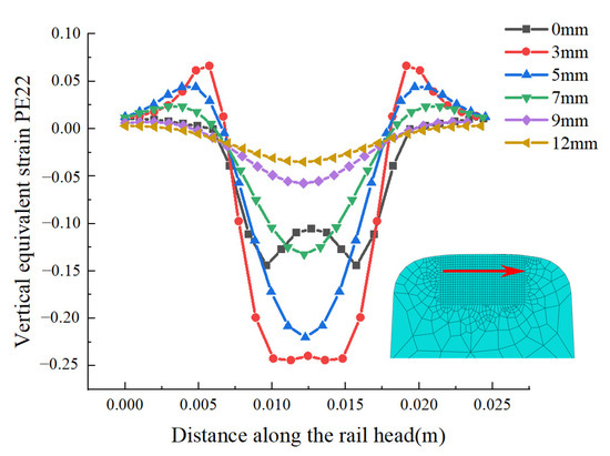 From the cloud map, it can be seen that there is significant stress concentration and plastic deformation below the rail head. The distribution of equivalent plastic strains along the rail head surface below 0 mm, 3 mm, 5 mm, 7 mm, 9 mm, and 12 mm is proposed, as shown in Figure 17.