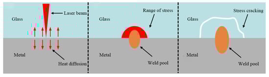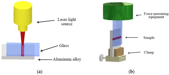 Currently, the connection between glass and metal in most scenarios relies on adhesive bonding. However, this method often fails in high-temperature and heavy-load environments. Therefore, in recent years, many scholars have researched the welding of glass and metal. Laser welding, with its advantages of high speed, small weld seams, and precise welding, is a highly feasible welding solution [,,,,,]. Nevertheless, due to the significant differences in the chemical and physical properties of aluminum alloys and glass, welding them together has always been a challenging task. Appropriate surface pre-treatment processes greatly enhance the welding strength between aluminum alloys and glass.
