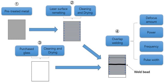 The schematic diagram of the process flow is shown in Figure 2. The selection of parameters was fine-tuned based on the relevant literature [,,,]. With other parameters fixed, the influence of the variable parameters on welding strength was investigated. Accordingly, the welding experimental plan in Table 4 was designed.