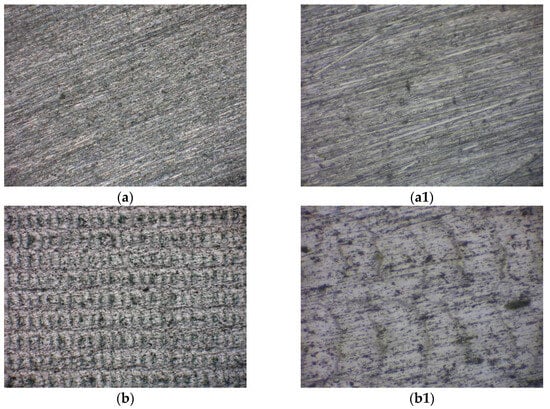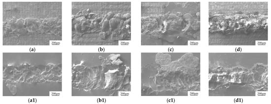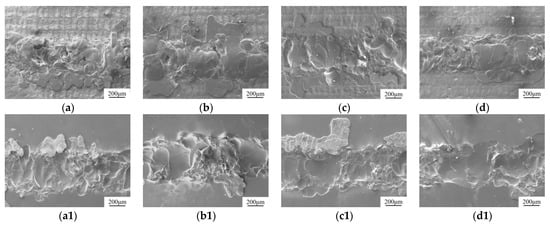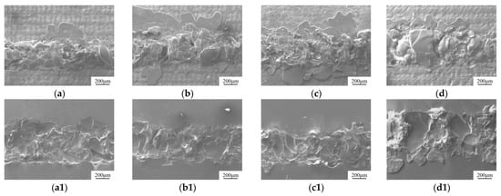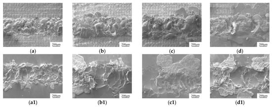 Welding cross-section images at different powers. (a,a1) Laser power 150 W. (b,b1) Laser power 200 W. (c,c1) Laser power 250 W. (d,d1) Laser power 300 W. (a–d) Metal side. (a1–d1) Glass side.