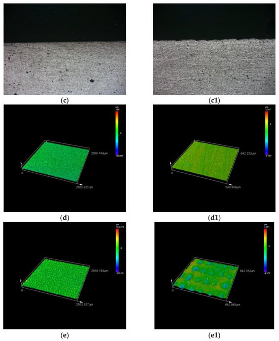 Surface and cross-sectional morphology. (a,a1) Before remelting. (b,b1) Surface after remelting. (c,c1) Cross-section after remelting. (d,d1) The three-dimensional morphology of the surface before remelting. (e,e1) The three-dimensional morphology of the surface after remelting. (a−c) Observed under optical microscope at 50× magnification. (a1−c1) Observed under optical microscope at 200× magnification.