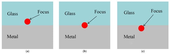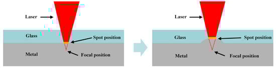 The laser spot of the Nd: YAG is formed by the convergence of multiple beams of light. Changing the defocus amount affects the position where the laser focuses during the welding process, which significantly impacts the amount of energy absorbed by the material being welded and, thereby, influences the welding seam. The effect of defocus amount on laser welding is primarily manifested in changes to the vertical position of the laser focus, as shown in Figure 4. Altering the vertical position of the laser focus changes the heat distribution during welding, which is a primary reason for the different welding outcomes observed. When the defocus amount is greater than 0, the focal point of the laser spot is above the metal surface, specifically, on the side of the glass. Conversely, when the defocus amount is negative, theoretically, the laser focus should penetrate into the interior of the metal. However, since metals are generally not transparent, when the laser interacts with the sample, the spot area is larger, and the heating efficiency is lower compared to the scenario where the focal point is precisely on the metal surface.