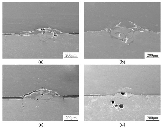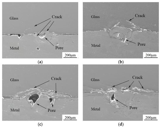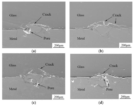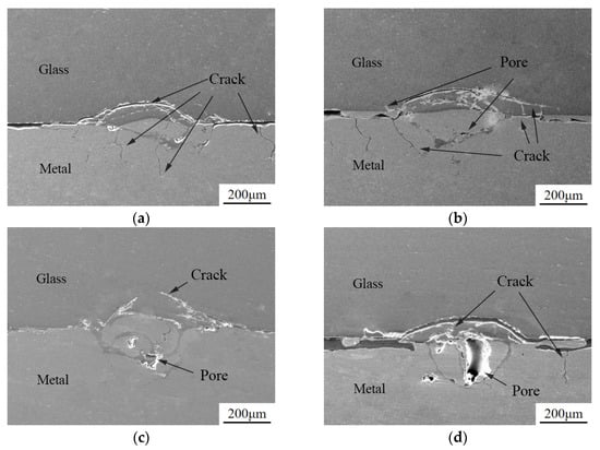 The welding experiments were conducted with a fixed power of 150 W, frequency of 10 Hz, and pulse width of 2.5 ms, with defocus amounts set at −1 mm, 0 mm, +1 mm, and +2 mm. Figure 5 shows the cross-sectional images of the welds at different defocus amounts. From the figure, it can be observed that when the defocus amount is 0 mm, the depth of the weld pool is greater, and there are fewer defects such as cracks and voids. When the defocus amount is +2 mm, the size of the weld pool is relatively smaller. This is because the laser focus is further away from the interface between the glass and the metal, and the energy cannot be fully absorbed by the aluminum alloy surface, resulting in a smaller weld pool.