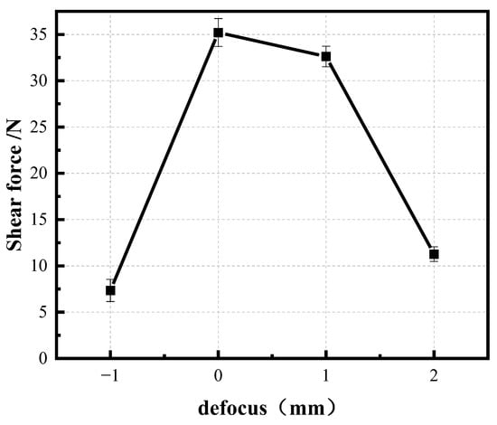 The results of shear force versus defocus amount are shown in Figure 7. From the figure, it can be observed that as the defocus amount increases, the shear force initially increases and then decreases. The reason for this phenomenon is analyzed as follows: when the defocus amount is negative, the laser cannot converge the beam effectively, resulting in lower heating efficiency. After welding to form a molten pool, the molten aluminum alloy overflows upward, raising the height of the processed surface. This disperses the beam further, reducing heating efficiency even more, as shown in Figure 8. As the defocus amount continues to increase to a certain extent, the focal point moves too far away from the material being welded, making it difficult to achieve the necessary heating for welding, thus reducing welding quality.