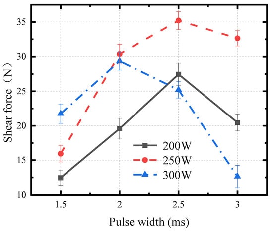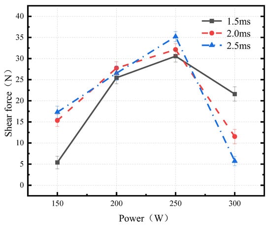 Additional tests on shear force variation with pulse width were conducted at 200 W and 300 W. It was found that the trend of shear force variation was the same at each power level. The curve of shear force variation with pulse width is shown in Figure 18. The figure indicates that as the pulse width increases, the shear force first increases and then decreases, with the maximum shear force occurring at 2.5 ms.