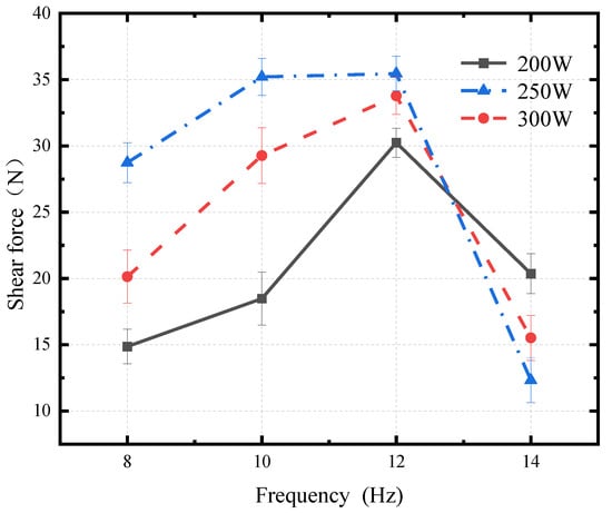 Since frequency and power are closely related parameters that significantly impact the energy input during welding, the relationship derived from one set of power parameters may not necessarily apply to other power settings. To better analyze the influence of frequency on welding and establish a more general rule, additional welding experiments were conducted by varying the frequency at powers of 200 W and 300 W. The shear strength versus frequency curve is shown in Figure 15. The maximum shear strength of 35.21 N was achieved at a frequency of 10 Hz. The trend of shear strength change under different power conditions is similar, with shear strength increasing initially and then decreasing as frequency changes.