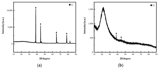 X-ray diffraction (XRD) is a technique used to analyze the crystal structure of materials, typically employed for studying the lattice structure of crystals, and for qualitative and quantitative crystallographic analysis. The main components of high borosilicate glass are boron oxide and silicon dioxide, both of which are amorphous. When using XRD for detection, a broad background rather than distinct diffraction peaks will be observed. Figure 19 shows the X-ray diffraction patterns of fracture surfaces on the aluminum alloy and high borosilicate glass sides. From the phase analysis results, it was found that the glass-side fracture contains a small amount of Al, which is due to aluminum alloy splashes peeling off and adhering to the glass during the shear test. The fracture on the aluminum alloy side mainly consists of the Al phase, indicating no chemical changes occurred to form new substances during welding. From the surface scan results of the fractures, it can be seen that glass residues often remain on the aluminum alloy side of the fracture. However, since the main components of glass are not suitable for XRD detection, no distinct glass components were found in the XRD results of the aluminum alloy side fractures.