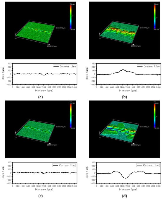 In Figure 20a, the 3D morphology and corresponding contour curves along the dashed line of the metal side after shearing a welded sample with power 150 W, frequency 10 Hz, defocus amount 0 mm, and welding speed 1 mm/s are shown. It can be observed that the fracture area on the metal side is lower than the metal surface, with a depression depth of about 40 μm and a fracture width of approximately 250 μm. Compared to the 3D morphology of fractures under other parameters, this fracture is narrower. When the laser power is increased to 300 W, the fracture morphology, as shown in Figure 20b, differs from other parameters in that the fracture area shows many protrusions without depressions. Contour analysis reveals that the residual material is about 124 μm higher than the metal surface, and the fracture width is approximately 900 μm, significantly wider than under lower laser power. Additionally, many splashes slightly higher than the aluminum alloy surface can be observed around the fracture, identified in previous studies as aluminum alloy splashes. Figure 20c,d show the 3D morphology and corresponding contour curves along the dashed line of the metal side after shearing welded samples with power 250 W, defocus amount 0 mm, and pulse width 2.5 ms, with frequency changes. When the frequency is 8 Hz, the fracture morphology is similar to that under lower power, with the fracture area depressed below the aluminum alloy surface. However, under this parameter, the depression is larger and wider due to the higher power and greater energy at a single point. Increasing the frequency to 14 Hz, as shown in Figure 20b, changes the 3D morphology of the fracture from a single depression to a state of both depressions and protrusions. The depression depth can reach up to 157 μm, significantly deeper than under lower power, with protrusions mainly distributed on both sides of the fracture and depressions concentrated in the central region.