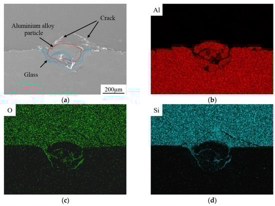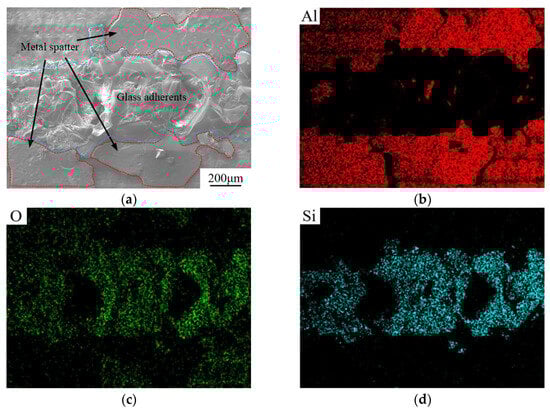 EDS surface scan analysis of fracture on glass side. (a) Surface morphology of the glass side. (b) EDS spectrum of element Al. (c) EDS spectrum of element O. (d) EDS spectrum of element Si.
