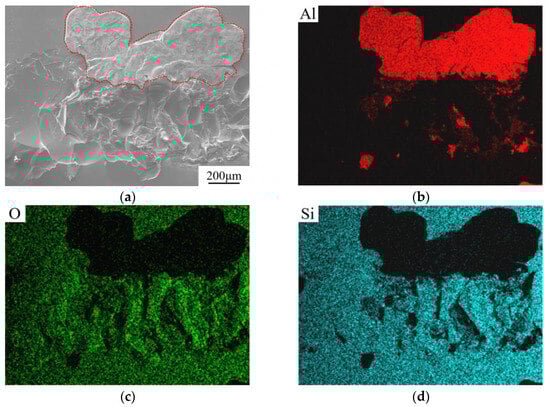 EDS surface scan analysis of fracture on metal side. (a) Surface morphology of the metal side. (b) EDS spectrum of element Al. (c) EDS spectrum of element O. (d) EDS spectrum of element Si.