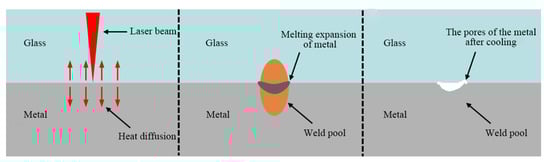 Octav P. Ciuca et al. used a picosecond pulsed laser to perform precision welding of 1 mm thick quartz glass and 1 mm thick pure aluminum sheets and analyzed the welded joints. However, due to the high transient characteristics of multiple picosecond high-energy density laser pulses and the differences in the thermophysical properties of the two weld components, the process of rapidly applying multiple picosecond high-energy density laser pulses to form a weld is complex []. Lin et al. used a 1064 nm fiber laser to weld quartz glass and anodized aluminum alloy. Under optimal processing conditions, with a scanning speed of 100 m/s and laser power of 2 W, the welding interface displayed a dense, uniform, and void-free morphology with an adhesive strength of 8 kg. However, aluminum alloys require anodizing treatment, a complex process that demands strict control of process parameters to ensure a high-quality oxide film []. Qiu et al. found that with a 5 μm thick micro-arc oxidation film, the optimal welding parameters were a laser power of 100 W, a frequency of 10 Hz, and a pulse width of 2.5 ms, which resulted in the maximum shear strength of the glass–metal weld. However, the micro-arc oxidation process is more complex and not easy to produce []. Li et al. used an ink immersion staining method for aluminum alloy surface pre-treatment. However, due to the presence of a large quantity of organic substances in the blackening ink of the aluminum alloy, the ink participates in the reaction during welding. Organic substances tend to release hydrogen at high temperatures, which could be the cause of porosity in the weld [].