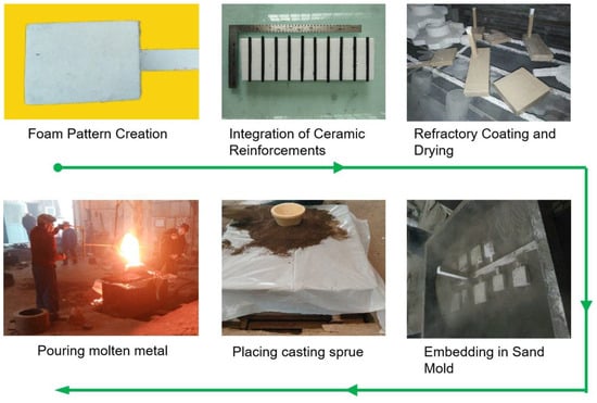 In this study, the lost-foam casting process was employed to fabricate large ceramic-reinforced TWIP steel matrix composites. The procedure involved several key steps to ensure the successful integration of ceramic reinforcements within the TWIP steel matrix.