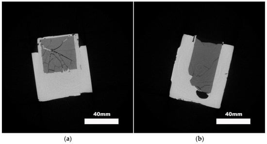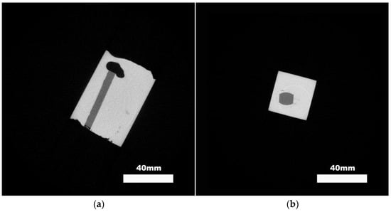 To analyze the effectiveness of the bonding between different ceramic shapes and the TWIP steel matrix, industrial CT was employed for non-destructive testing. The results for plate and block ceramics are illustrated in Figure 4.