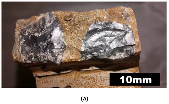 - It was observed that blocky (115 × 40 × 25 mm) and flaky (40 × 40 × 5 mm) ceramic reinforcements experienced significant cracking and fragmentation during the lost-foam casting process. These defects compromised the integrity of the composite and diminished the reinforcement’s effectiveness. In contrast, rod-like (φ5 × 95 mm) and granular (φ10 × 10 mm) ceramics demonstrated superior compatibility with the TWIP steel matrix. They maintained their structural integrity, resulting in a robust and cohesive composite structure.